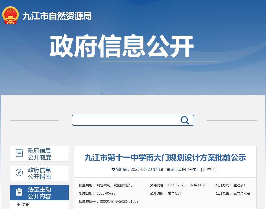 5月23日,從九江市自然資源局官網獲悉,九江市第十一中學南大門規劃設計方案批前公示正式發布,詳情如下: